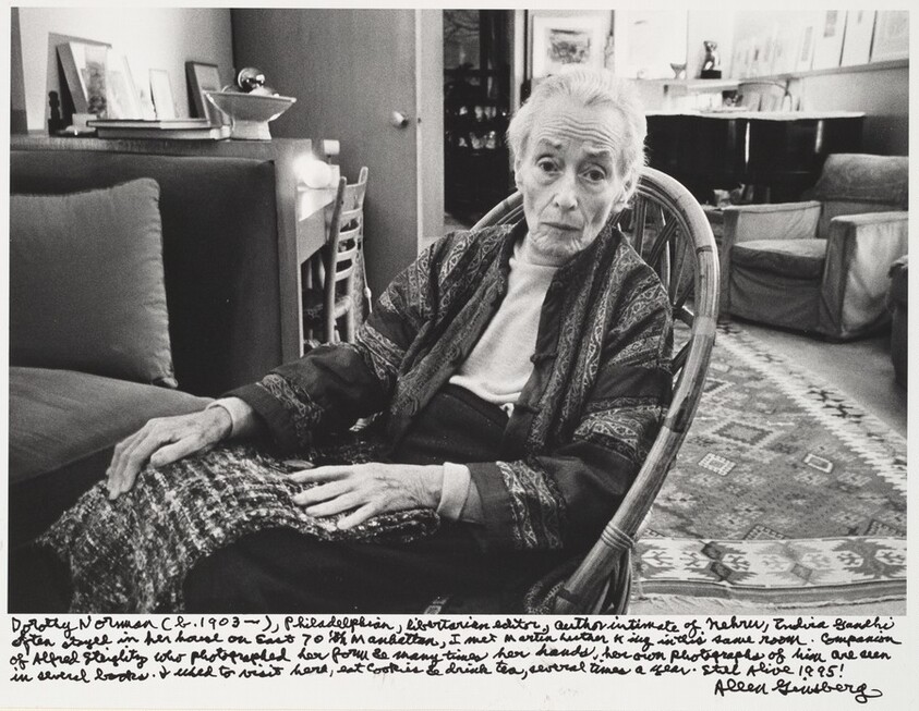 Dorothy Norman (b. 1903-), Philadelphia, libertarian editor, author intimate of Nehru, Indira Gandhi often stayed in her house on East 70th Manhattan, I met Martin Luther King in this same room, Companion of Alfred Stieglitz who photographed her form so many times her hands, her own photographs of him are seen in several books. I used to visit here, eat cookies & drinks tea, several times a year. Still Alive 1995!