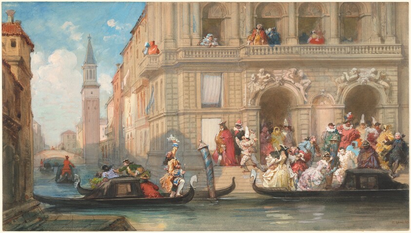 Masqueraders Boarding Gondolas before a Venetian Palazzo