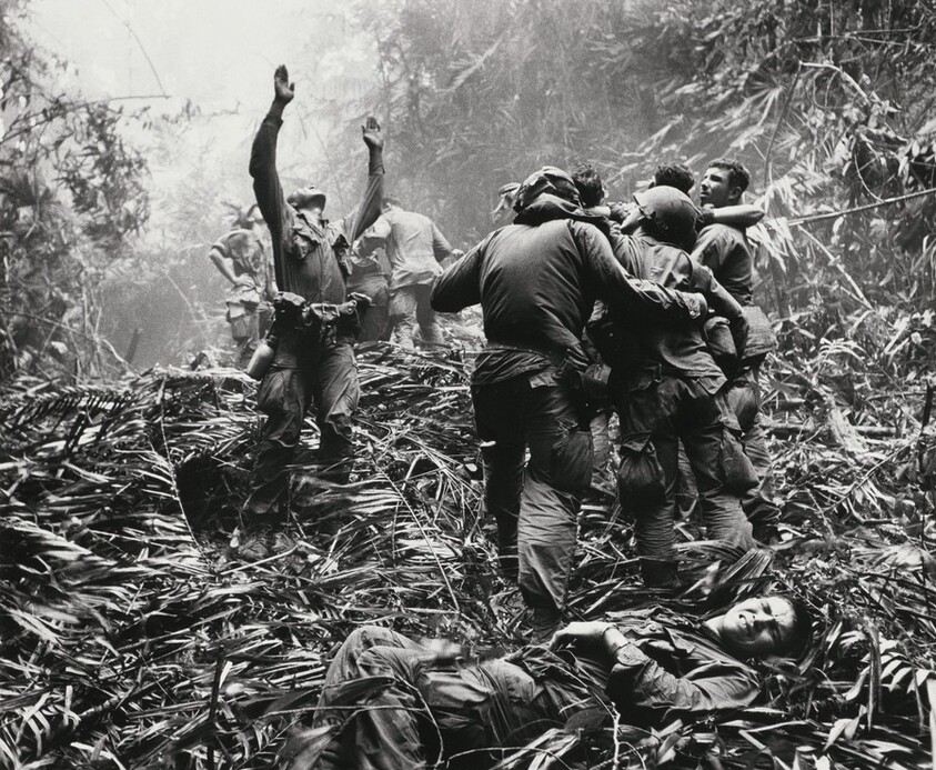 Paratroopers aid wounded comrades as one GI guides a medical evacuation helicopter into a jungle clearing