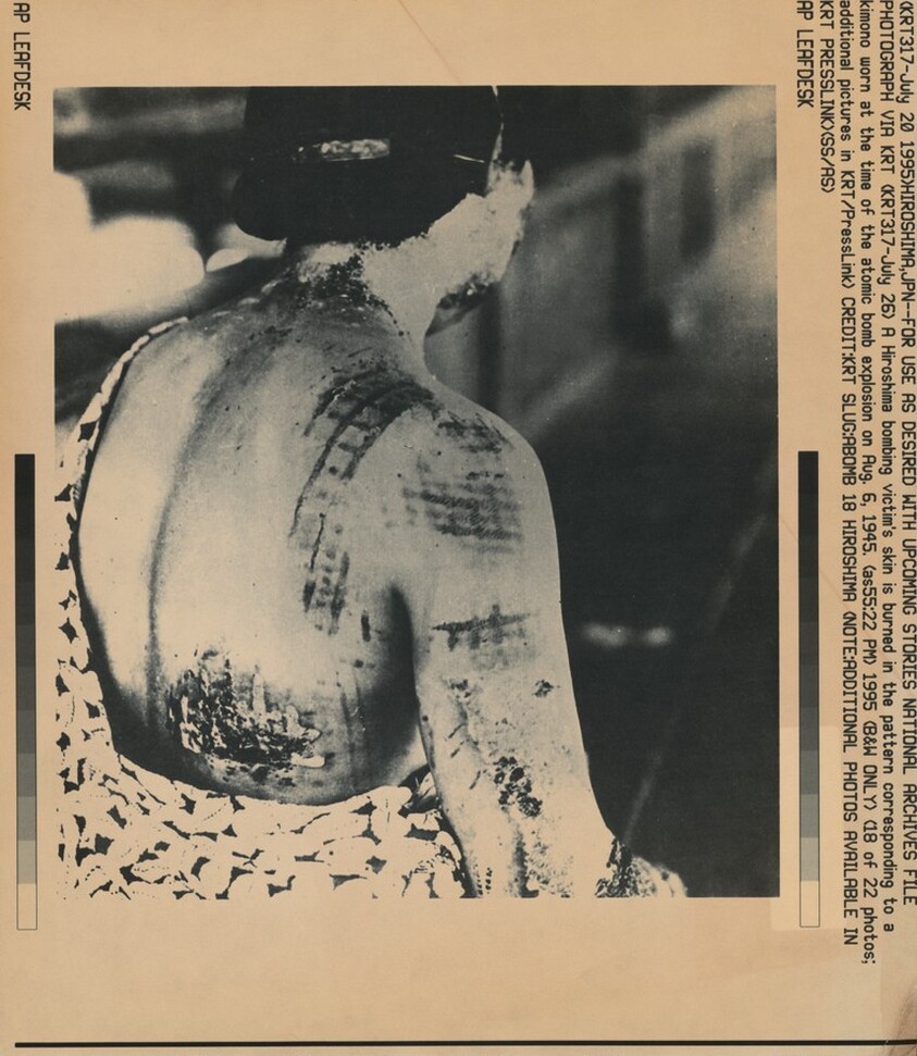 Title from caption on object: “A Hiroshima Bombing Victim's Skin is Burned in the Pattern Corresponding to a Kimono...”