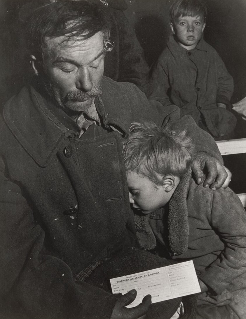 Unemployed father with son, at a Worker's Alliance meeting in North Platte, Nebraska