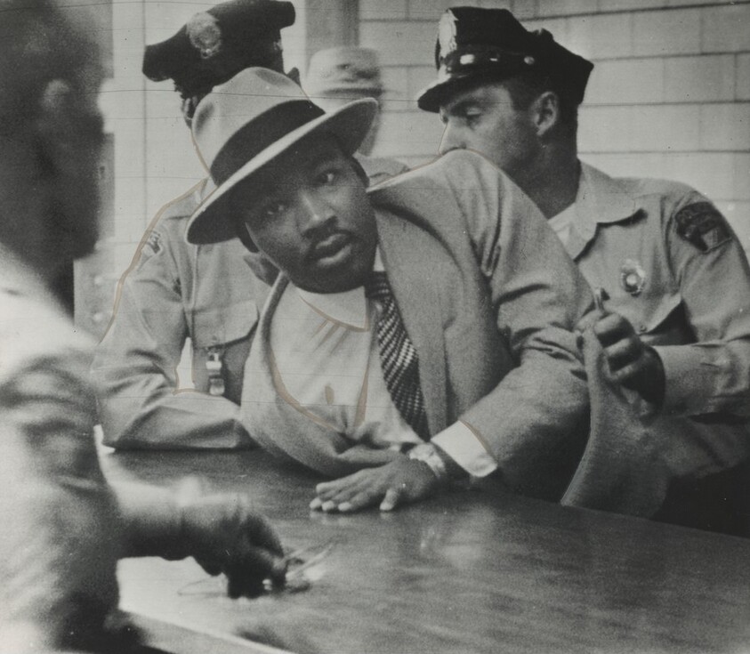 Title from caption on object: “Arrested on a Charge of Loitering Wednesday the Rev. Martin Luther King, Jr., Accused Police of Brutality…”