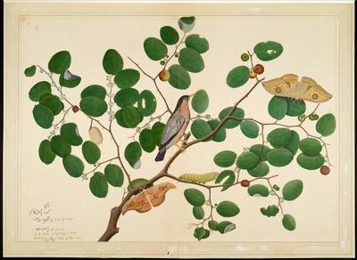Brahminy Starling with Two Antheraea Moths, Caterpillar, and Cocoon on Indian Jujube Tree