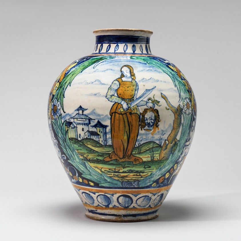 Vase with shield of arms of Guidobaldo I Montefeltro and Judith with the head of Holofernes