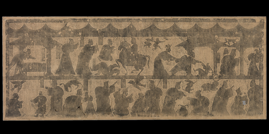 This rubbing corresponds in composition with stone reliefs from the east wall in stone chamber 3 of the Wu Liang shrine. The upper register illustrates stories of virtuous women. Read from right to left, the last scene in the upper left corner shows a bed under a roof that is labeled “Virtuous Woman of the Capital.” The story relates that a woman was blackmailed into helping to kill her husband. She pretended to cooperate but took her husband’s place in bed. When the killers realized in the morning that they had decapitated the woman, they abandoned their murderous plan.
