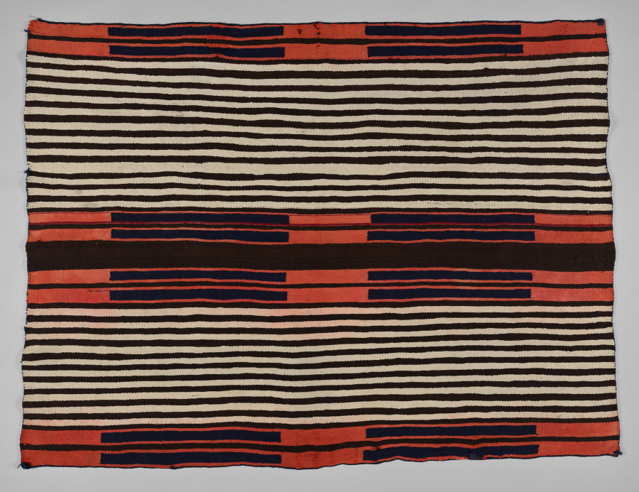 Diné (Navajo) artists wove geometric designs that reference the natural environment as well as embody spiritual insights and meanings. Specific patterns were inherited but also evolved over time. This blanket was created during the late 1800s, when weavers in the Southwest began to shift from making garments for Indigenous use, including trade, to additionally create items for non-Native collectors. In this new market, traditional wearing blankets, which were worn around the shoulders, were purchased as rugs.
