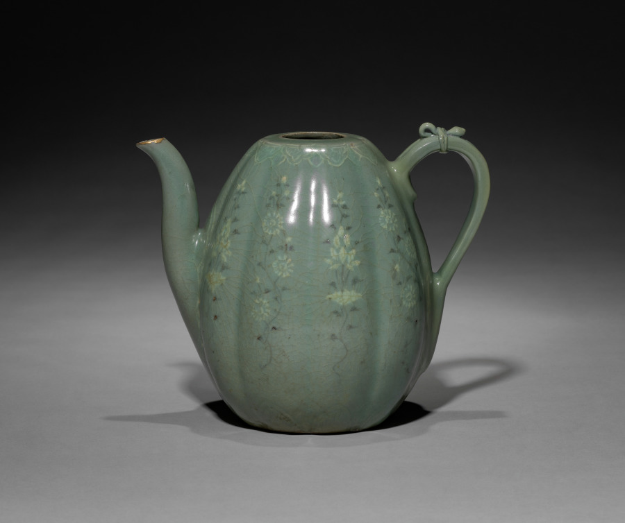 This melon-shaped pitcher is adorned with a delicate drawing that renders chrysanthemum buds with full blossoms in white and black inlays. In Korea, chrysanthemum flowers and leaves were made into both tea and wine. Chrysanthemum wine was enjoyed during the the Double Nine Festival (the ninth day of the ninth month in the lunar calendar) when praying for longevity.