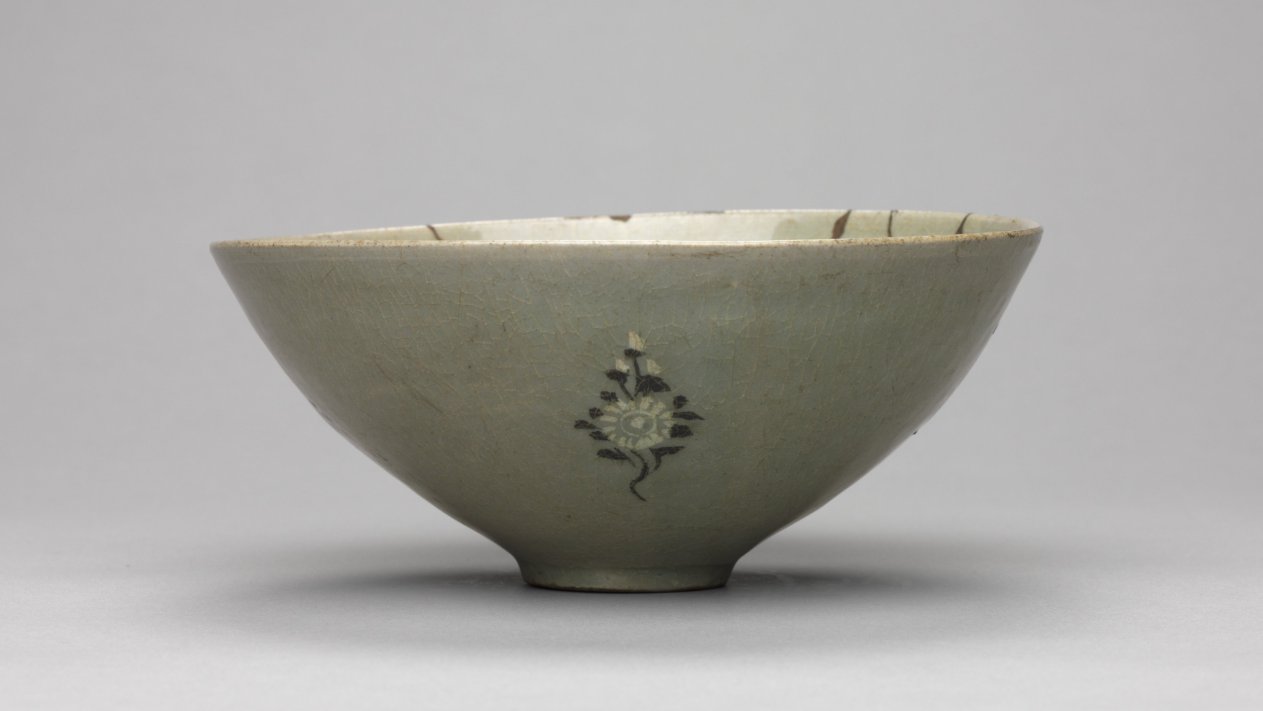 As early as the seventh century, the practice of drinking tea and wine became an important part of elite leisure culture in Korea. A wide bowl like this example was especially suitable for drinking powdered tea shaved from a compressed tea cake, the most commonly enjoyed type during the Goryeo period. While the inlaid image of bloomed chrysanthemums decorate the outer wall, that of fish swimming waves in relief appear on the inner wall of this tea bowl. Such elaborate design tell us that tea wares then were aesthetically invested objects of luxury.