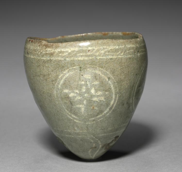 Toward the late 14th century, the overall quality of techniques involved in making celadon works sharply deteriorated. In contrast to translucent greenish blue celadon works of the 12th century, this drinking cup possibly dated to the late 14th century, has gray greenish glaze. And its inlaid design also shows a clear sign of decline in craftsmanship. Nevertheless, less attention to techniques gave a way to a freer style of pottery called buncheong in the succeeding centuries.