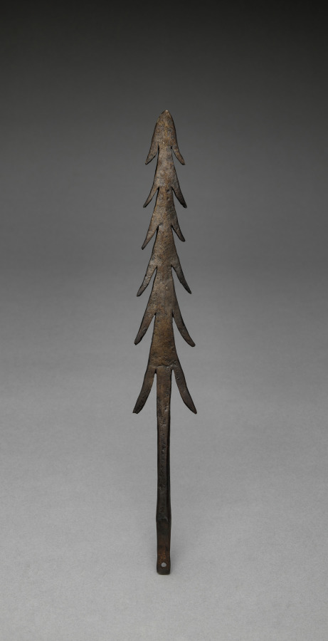 This forged iron spearhead features a long central blade and multiple paired barbs tapering in a tree-like silhouette. Its stepped barbed form aligns with spears documented in Eastern Lepanto and Northern Nueva Vizcaya.