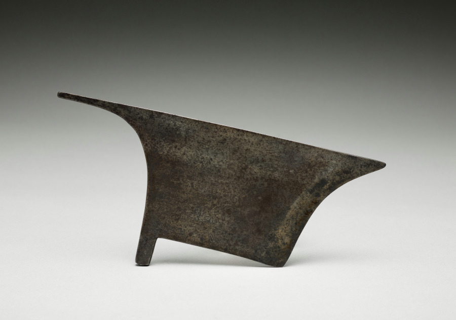 This iron blade belongs to a Bontoc head axe, a northern Luzon weapon known for its heavy, compact form. The broad, triangular cutting surface, long, tapering rear spike, and short lower tang built to slot into a wooden shaft are all characteristic of northern Luzon. The shaft includes a protruding “thorn” or finger stop that provided a secure grip.