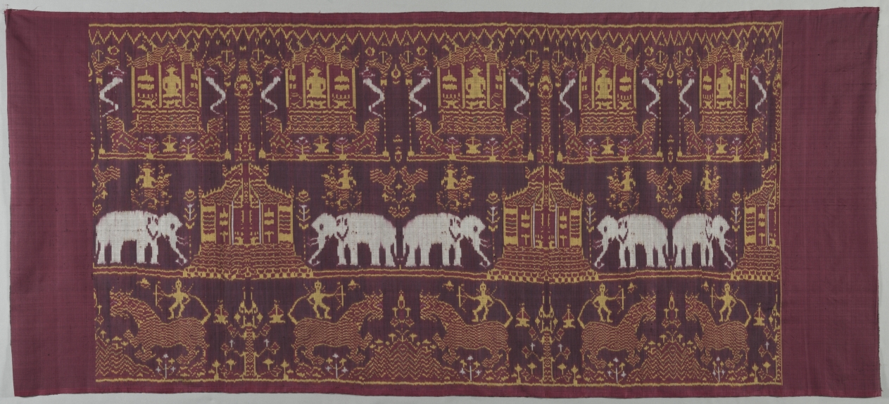 The silk wefts of this textile were resist dyed with a design of elephants, temples, large tigers (?), sacred trees, and humans before the textile was woven. Both the weft-ikat technique and the motifs reveal the influence of Indian textiles, particularly patola. The dark reddish-maroon color of the ground, however, was not produced by over-dyeing, as in India and Bali, but by the combination of red wefts with black warps. This silk was made to serve as a wall hanging or ceiling canopy in a Buddhist temple.