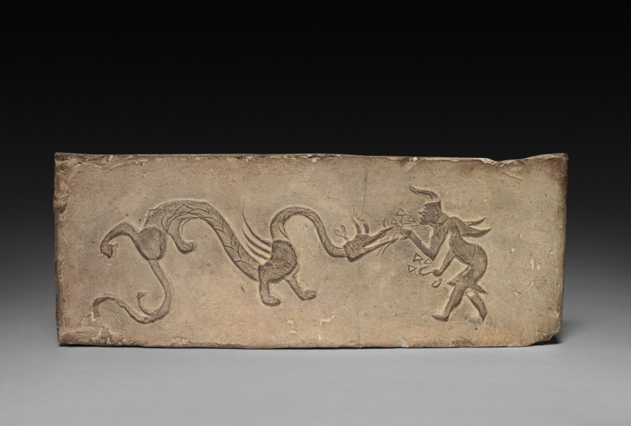 Han dynasty tombs were often furnished with grave goods to provide the deceased with items for the afterlife. This panel with a dragon was part of a miniature pottery stove to be placed in a burial chamber. This scene of a dragon being fed fungus by a winged fairy is molded on the panel. The dragon is an auspicious creature and an animal of the cardinal directions that protects the east.