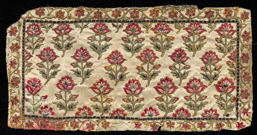 When closed, the horizontal stack of Jain manuscript pages is protected by firm covers on the top and bottom. A donor may commission a luxurious textile to place over or wrap the sacred text to honor it. Textiles with repeated floral plant patterns—these appear to be roses—were popularized at the imperial Mughal court during the mid-1600s, after which they spread throughout India.