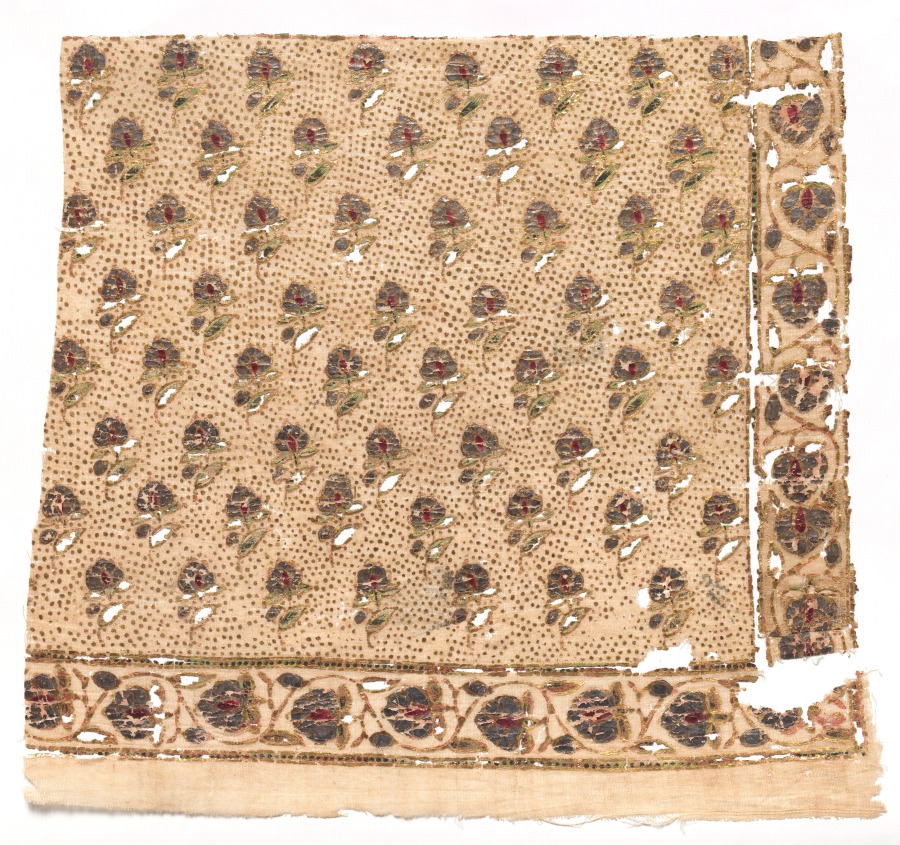 Block printed and overprinted with gold and silver leaf (varak) and overpainted with pigments on plain weave cotton muslin