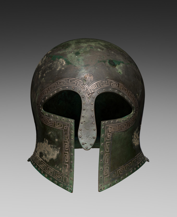 Probably cast and then hammered into shape, this bronze helmet belongs to a type known as Corinthian, with almond-shaped eye holes, large cheekpieces, and a wide nose guard. Its significant weight raised early suspicions about authenticity, and although a 1928 technical examination found no conclusive evidence of forgery, scholars have continued to doubt its antiquity. Unusual details include the intact rivets, or metal fasteners, meant to secure liners; usually only their holes survive. The dueling warriors and inlaid palmette above the brow also find few parallels, and the silver meander pattern is unique. Most recently, a 2024 analysis found that both the copper and silver alloys of the helmet differ significantly from those expected in an ancient Greek helmet.