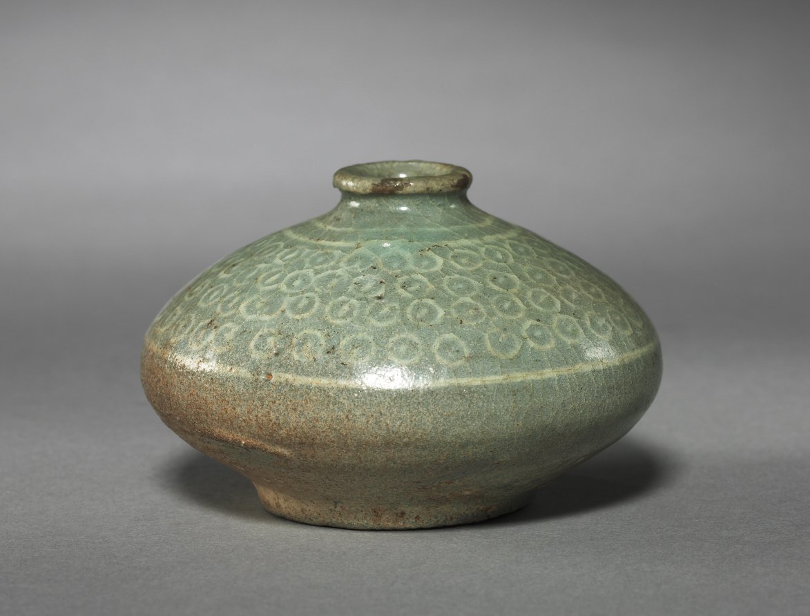 Celadons, spoons, seals, and bronze mirrors were the most common burial objects in tombs during the Goryeo period (918-1392). Once used to contain oil treatment for hair, this little celadon bottle was one of the standard goods that furnished elites' tombs.