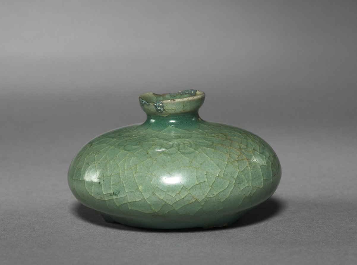 Celadons, spoons, seals, and bronze mirrors were the most common burial objects in tombs during the Goryeo period (918-1392). Once used to contain oil treatment for hair, this little celadon bottle was one of the standard goods that furnished elites' tombs.