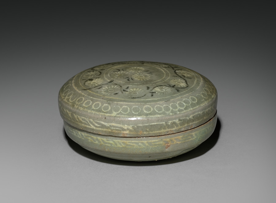 Celadons, spoons, seals, and bronze mirrors were the most common burial objects in tombs during the Goryeo period (918–1392). Once used to contain colored powder, rouge, and eyebrow gel for makeup, this small container was one of the standard goods that furnished elites' tombs. Both women and men used the grain powder of rice or millet for whitening their skin, safflower extract for rouge, and plant ash or soot for eyebrow gel. Yet, natural-looking makeup seems to have been the most favorable one in Korea according to the travelogue by Xu Jing (1091–1153), the Chinese diplomat who visited Korea in 1123.