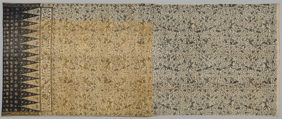 This sarong, overlaid with gold leaf (or gold dust), would have been worn for high ceremonial occasions and festivals. The gold has been applied only to the parts of the sarong that would show when draped, and on one side only. The delicate, linear design with Chinese phoenixes, butterflies, and leafy tendrils is one of the characteristic styles of batiks made in cities along the north coast of Java. The "tumpal" (triangle) design of the wide end border (a pan-Southeast Asian motif that commonly occurs on northern Javanese batiks) seems to have symbolized growth and fertility as well as the sacred mountain, Meru.