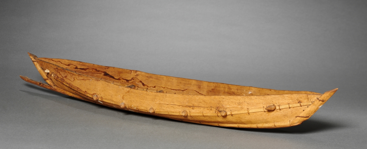 Made of plain wood, this is a model of a canoe with a prow, seats, and five paddles. Composed of multiple panels sewn together with fibers, it was described in historical museum documents as a "war canoe." Similar examples from around the same period are found in American and European museums, where they had been collected in eastern, central, and western Africa as anthropological artifacts rather than as artworks. While the archives have little information about this object, it appears similar to Ugandan sewn plank canoes and to a model example collected in Uganda between 1890 and 1910 now at the British Museum.