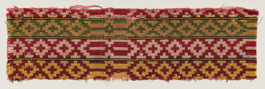 This textile is made of woven silk, with a pattern of repeating crosses alternating in different color combinations. The fragment was likely once part of a furnishing textile, perhaps used to cover a pillow or other household object.