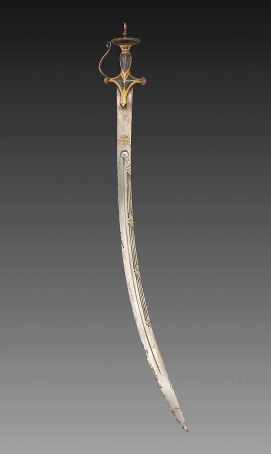 The exceptionally thin, curved blade is made of watered steel. The grooves, called fullers, allowed for weight reduction and prevented flexion. The costly hilt is fully overlaid with brass in steel, both inside and outside the knuckle.