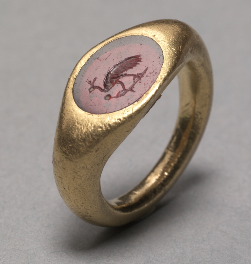 Made of gold inset with chalcedony, a type of quartz, this simple yet elegant signet ring has timeless appeal. A skilled artisan carved a peacock into the oval stone creating an emblem that would have had personal meaning for the owner.