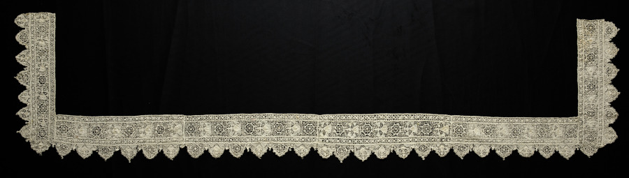 In this piece of lace edging, squares with a geometric design alternate with a motif of a bee, the symbol of the Barberini family.