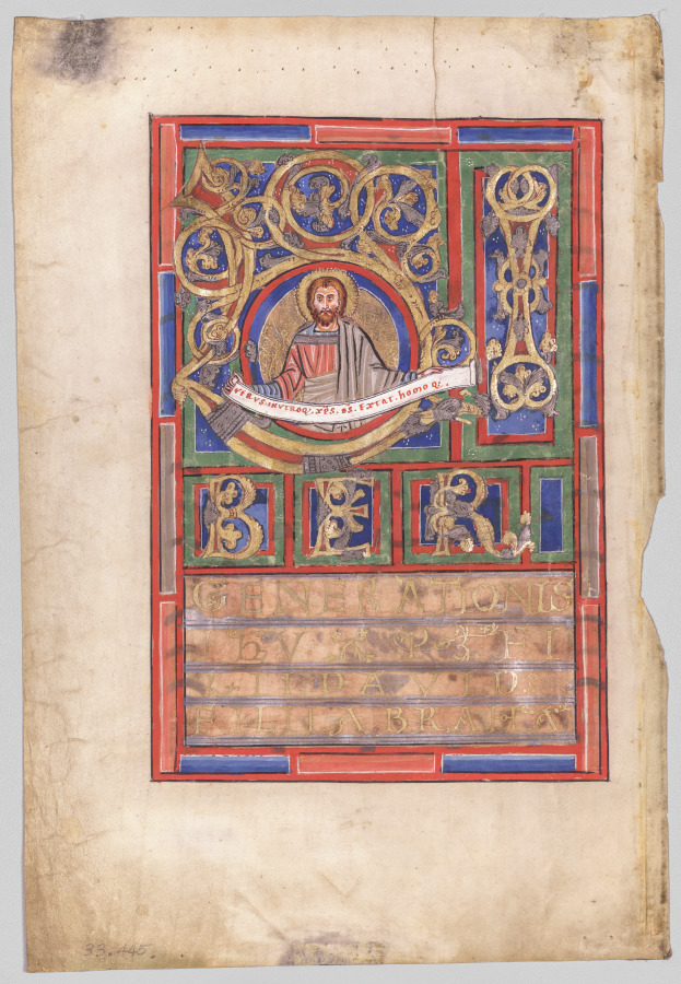 Single Leaf Excised from a Gospel Book with Initial L[iber generationis]: St. Matthew (verso) by — VisualArtsDB
