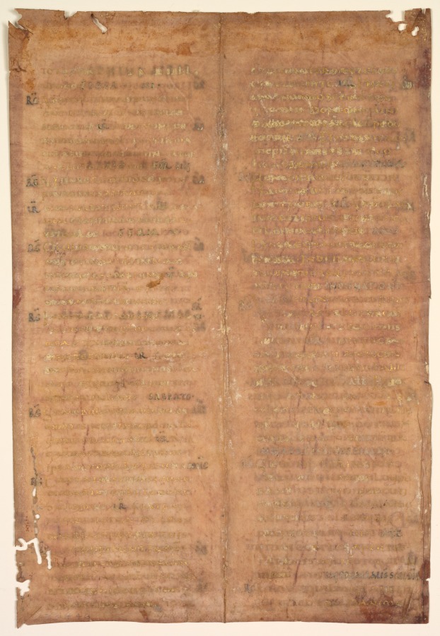 This rare leaf comes from a cantatorium or gradual, a book containing the chants to be sung during the Mass. Other leaves from the same book survive in Berlin and Trier. A bifolium, or double-leaf, it does not contain decorated letters but rather "emphasized" letters. These were enlarged and pushed out into the margins to call attention to the eye. Such emphasized letters originated in late classical times and were the precursor to the decorated initial developed by medieval scribes. The purple-stained vellum (now faded to a deep pink) with its text written in gold and silver inks (now turned black) suggested great luxury with its sumptuous appearance. In Mediterranean regions, the purple dye was obtained from murex, a shell-fish dye. In northern Europe, plant dyes were used as an alternative. Combined with the use of gold and silver ink (now turned black) a spectacular appearance was achieved that is traceable back to classical antiquity.
