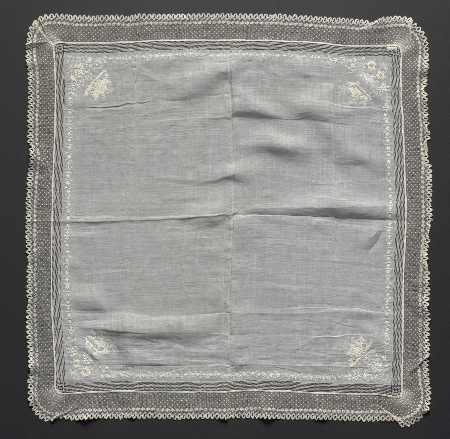embroidery on linen ground; lace edging