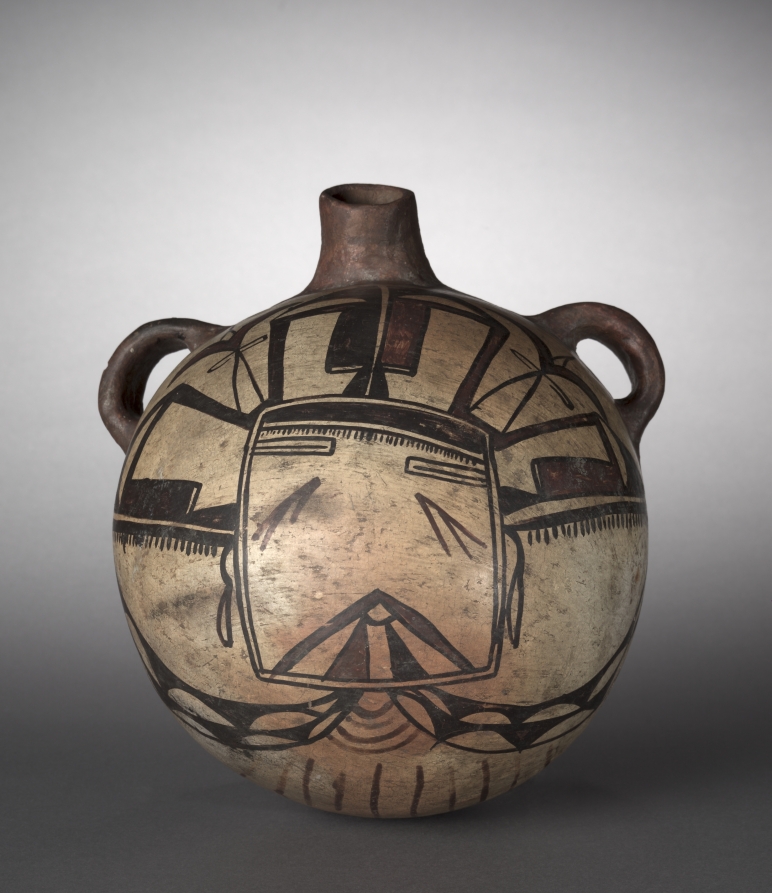 Since the 1500s, Hopi women made big-bellied canteens, based on Spanish prototypes, and used them to carry water. By the late 1800s, canteens became popular with Euro-American tourists, who increasingly flocked to the Southwest in search of encounters with “exotic” Native American cultures. Thus, Hopi artists embellished their wares to improve their appeal. This example is painted with a face similar to a Katsina’s, a spirit being central to Pueblo religion—but it is a fanciful rendition, not an actual Katsina. Could the maker have been taking control of her culture and its consumption by outsiders?