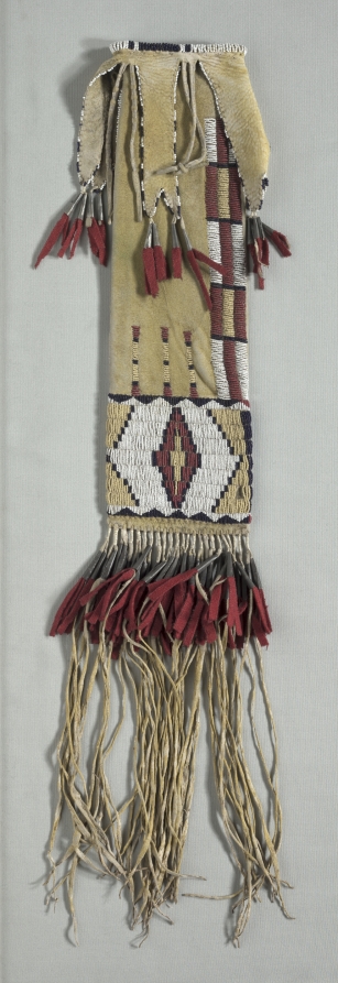 The shape of this bag indicates it was made to hold tobacco and one of the pipes that played a paramount role in the lives of Plains nations. Smoking is a means of prayer—the smoke carries thanks and entreaties into the other-than-human realm—and pipes were lit to seek protection and guidance on new endeavors, during alliance and dispute negotiations, to mark life’s milestones, and in many other situations. By the late 1800s, when this example was made, such bags were a standard element of prestigious men’s formal dress regalia.