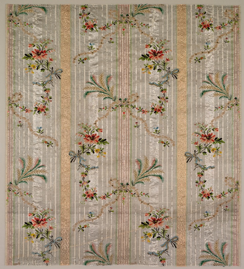 taffeta, brocaded and embroidered; silk, gold, and silver