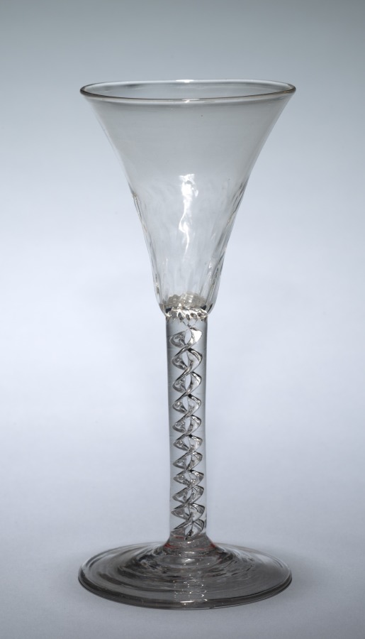 While most of the vessels in this display were made for diverse alcoholic beverages, this modest English glass, its stem twisted with air bubbles, was used exclusively for wine. Glassmaking in England was largely contained to domestic objects, and the many glasses for wine that still exist from the 1700s suggest the growing popularity of wine among Britain’s upper-middle class.