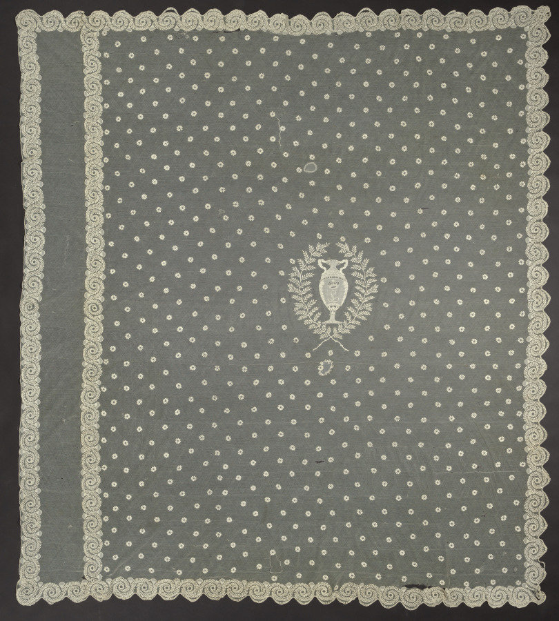 In the center of this bed canopy is a vase embroidered with the letter "L" and a coronet above it and a wreath of leaves surrounding it.