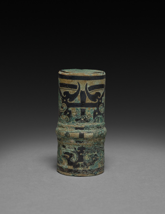 This small circular finial is treated with whorls, angles, and horn- or beak-like parts that suggest either oxen or birds.