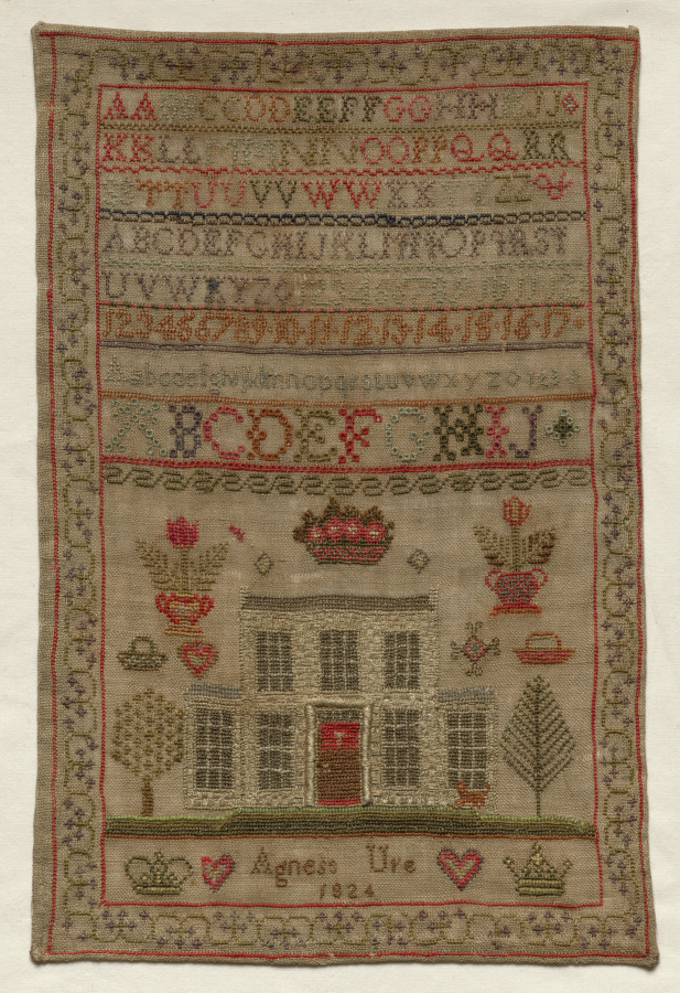 embroidery; silk and wool on linen
