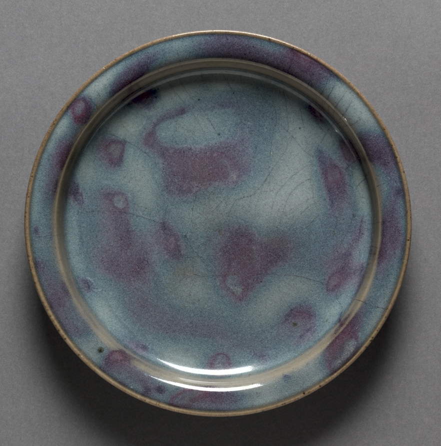 This shallow plate's light gray stoneware body is covered with a thick glaze of intense robin's egg blue suffused with deep amethyst patches.