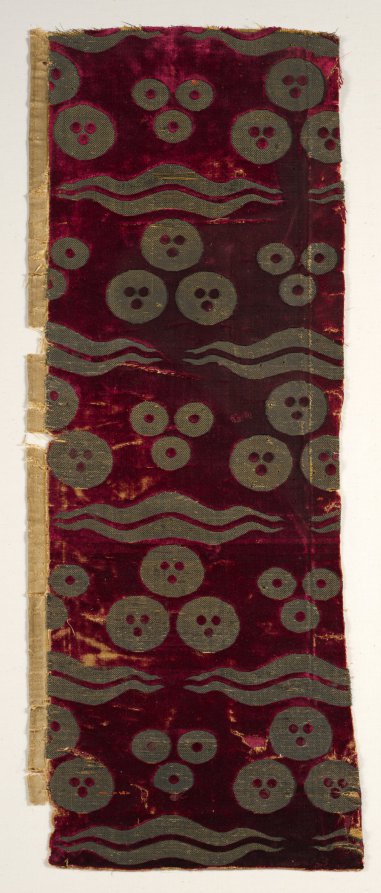 This early Ottoman brocaded velvet was woven in an imperial workshop in the prosperous city of Bursa, the silk capital and major commercial center of the Ottoman Empire. It has exceptionally rich crimson silk pile, almost twice as dense as later monochrome velvets. The brocaded pattern of three balls and paired wavy bands is known as chintamani, derived from the Sanskrit word for a popular Buddhist motif, “the three jewels,” shown surrounded by flames or foliage in Buddhist art across Asia. Based on the high frequency of its use in art for the Islamic court of the Ottoman Turks, it appears to have been a favored motif and possibly even an unofficial imperial emblem.