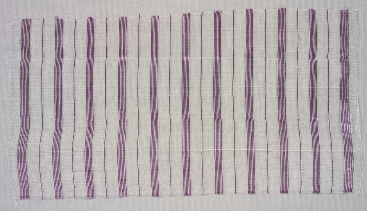 This fabric is woven in plain weave using a piña ground with vertical bands of closely spaced silk warp stripes arranged in a repeating pattern. The stripes run the full length of the cloth.
