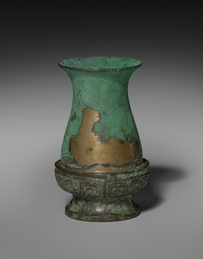 This tall, slender bronze wine vessel, called a hu, has three bands of ornamentation: one above the foot, one around the neck, and one on the cover. Stylized birds or phoenixes are in the band around the neck, while the band on the cover and foot feature geometric dragons. The dragon and the phoenix may represent the Yin and Yang and would be equally appropriate on a bronze of either secular or religious purposes. It likely held liquids like wine at festive banquets or religious ceremonies.