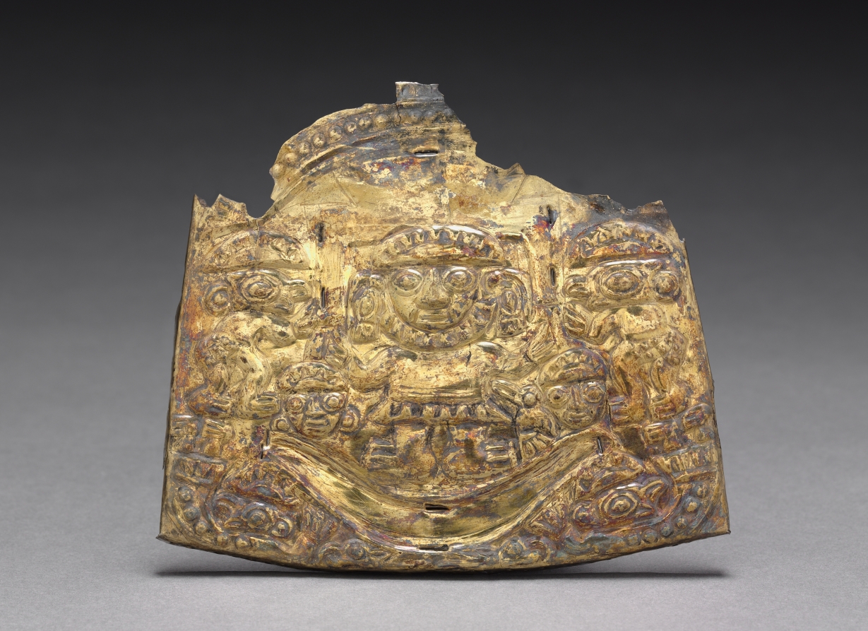 Frontal figures flanked by profile attendants have a long history in the Andes. This is the quintessential group of authority and power, here a Chimú lord and two creatures perhaps from mythology. Ancient Andean cultures did not use writing, so it is difficult to know more about the scene's meaning. Additional elements, probably also of gold, originally were tabbed through the slots on the surface.
