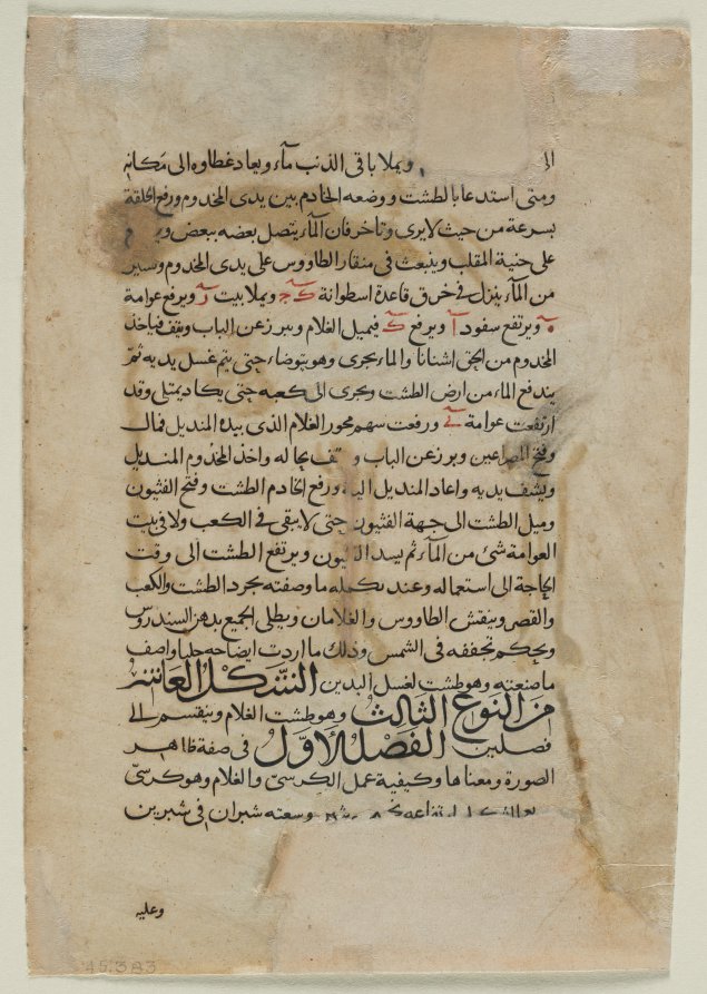 The Arabic title of this work is Kitab fi ma'rifat al-hiyal al handasiyya (The Book of Knowledge of Ingenious Mechanical Devices). According to the description of the device illustrated on the other side of this page, the peacock is filled with water: as it flows into the vessel below, it raises a float that opens a door in the section above, causing the little figure to move forward offering soap; as more water flows, a second door will open and another figure will move forward offering a towel. Finally, the dirty water is drawn off by means of a spigot.
