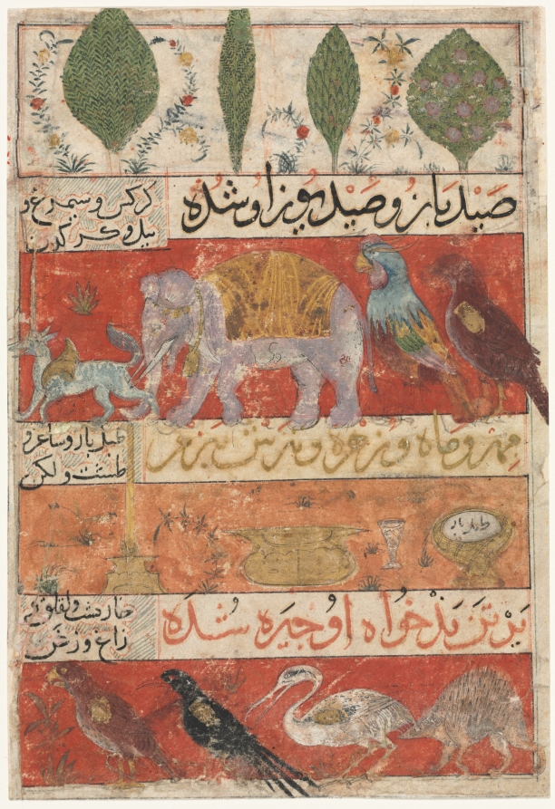Animals, Birds, and Plants (verso) from a Mu'nis al-Ahrar fi Daqa'iq al-Ash'ar (The Free Men's Companion to the Subtleties of Poems) of Muhammad Ibn Badr al-Din Jajarmi (active 1340s) by — VisualArtsDB