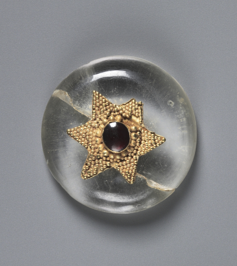 The decorative technique known as granulation had been used in Etruscan, Greek, and Roman jewelry well before this Byzantine piece was made. Granulation is when tiny spheres or “granules” are attached to a piece. It can be seen here in in a rock crystal button decorated with a six-pointed star, with a simply set garnet in the center.