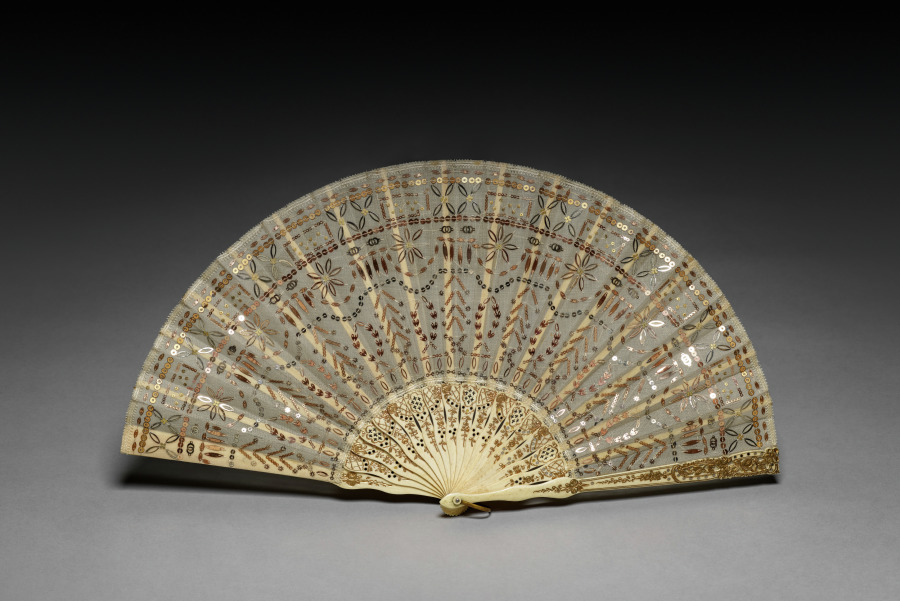 bone with gold paint, nickel (?) plated brass inlays, gauze with gold and silver colored sequins, copper alloy ring