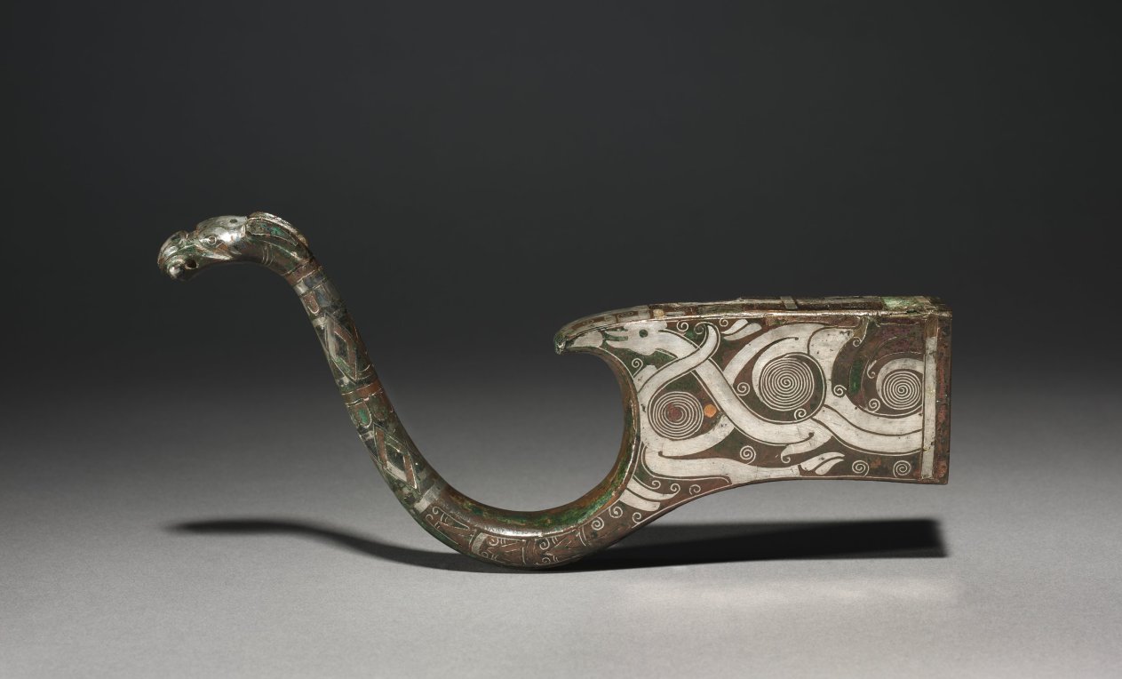 Here, the rectangular socket of the bow support tapers elegantly to form the slender neck of an animal head. Silver inlay of wires and ribbons form an extraordinarily beautiful abstract design consisting of sweeping lines, coils, spirals, and serpentine interlaces.
