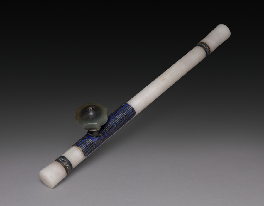 jade stem decorated with silver ferrules embellished with enamel; jade bowl